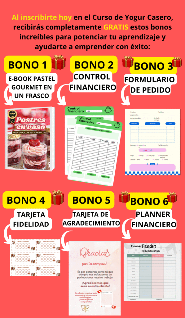 El curso de YOGUR CASERO fue creado pensando exactamente en cómo resolver tu principal problema: GANAR DINERO. Y como resultado, también te ayudará a mejorar muchas otras áreas de tu vida. Es conjunto de 20 recetas DELICIOSAS que te ayudarán a generar ingresos extra desde casa.